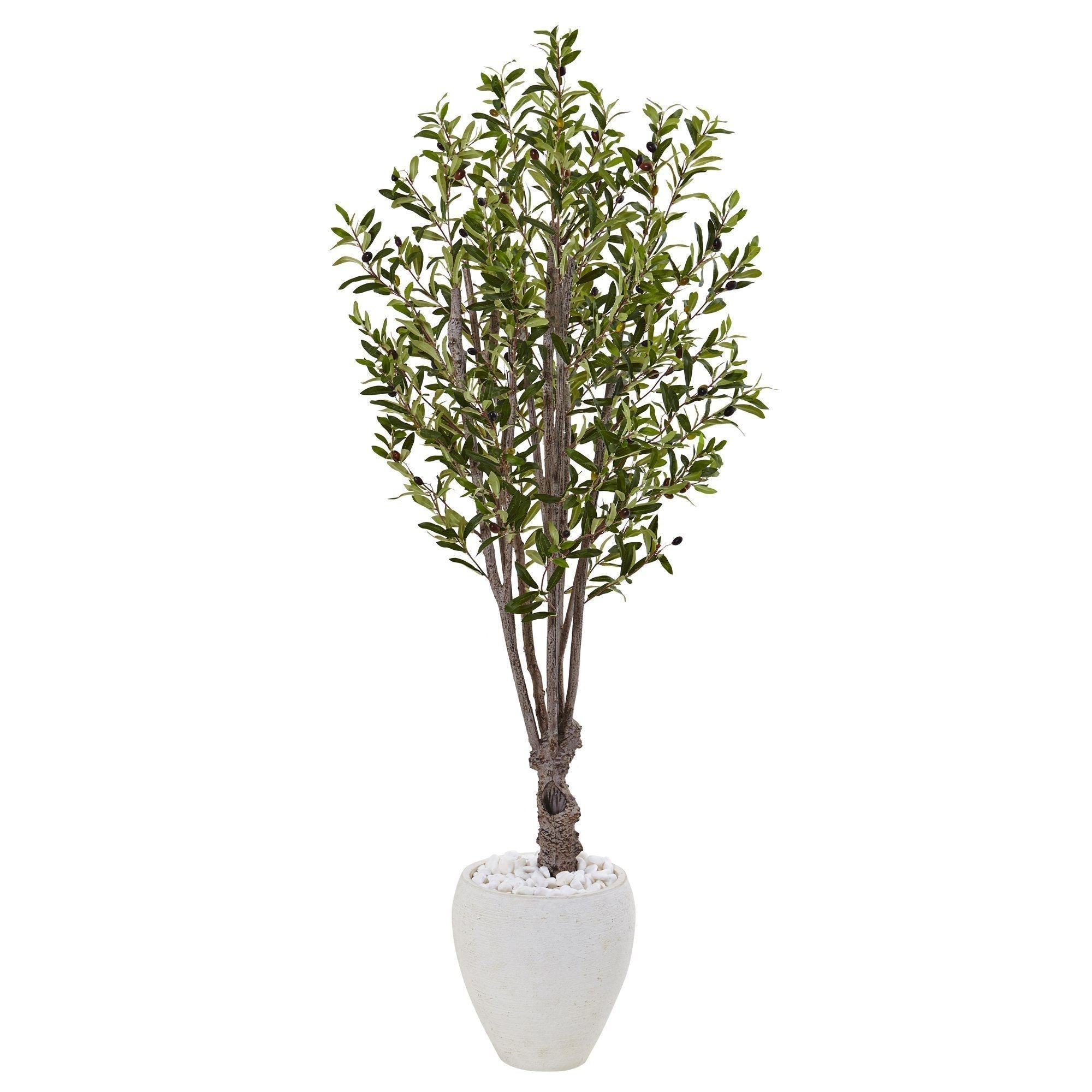Exquisite craftsmanship is evident in the fine details of this artificial olive tree. The lifelike trunk splits into several branches and the leaves rise up as if to embrace the sunlight. Comes in a white textured oval planter with smooth river rocks.